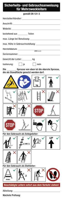 Sicherheits- und Gebrauchsanweisung für Mehrzweckleitern, Aufkleber, DIN EN 131-3