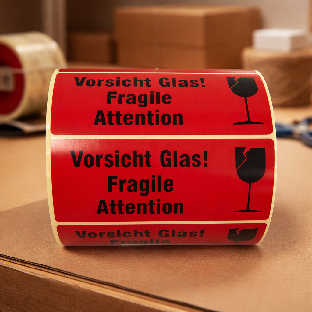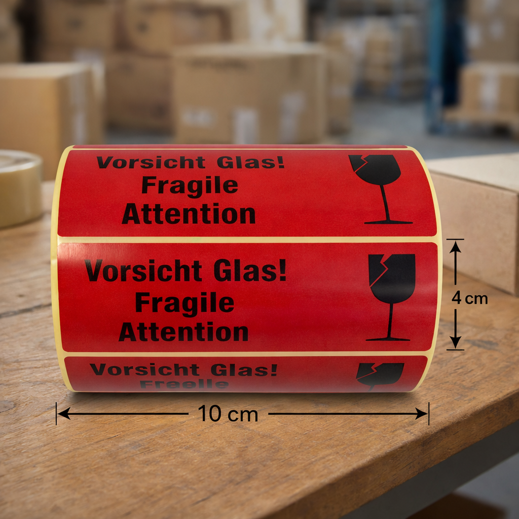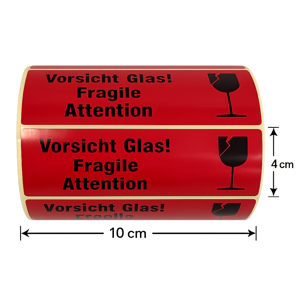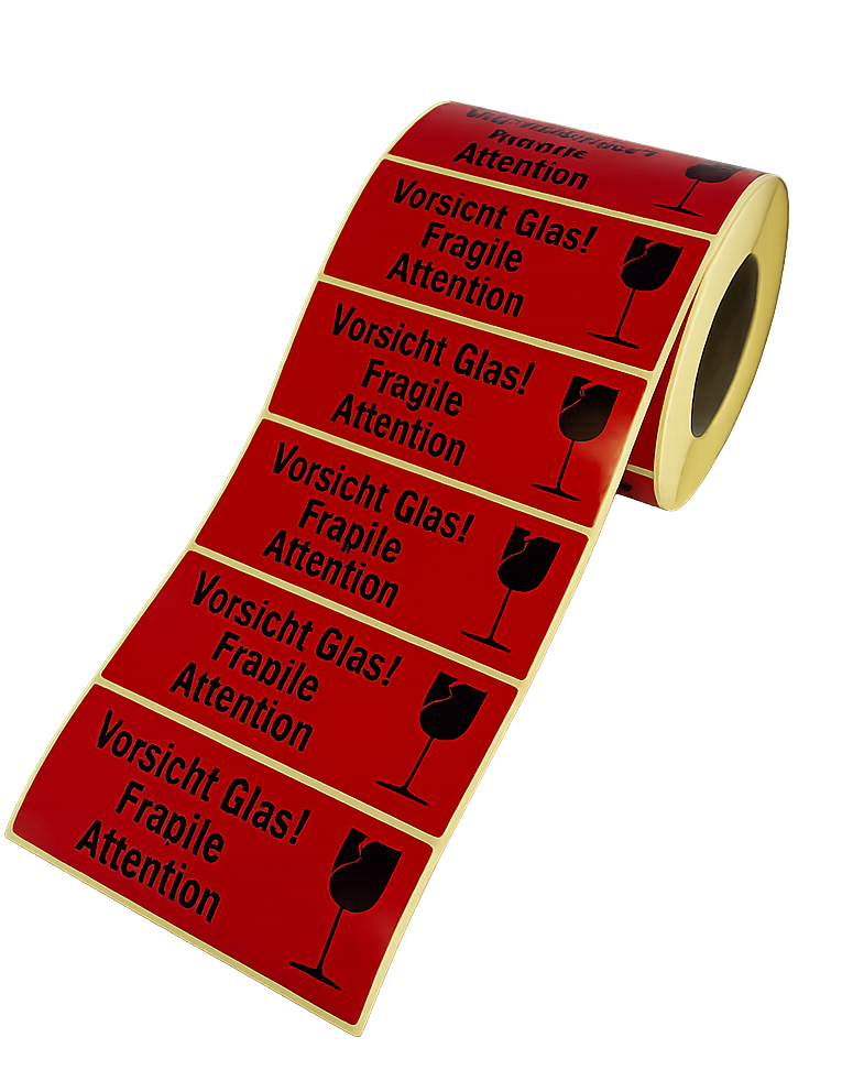 Dank der auffälligen roten Farbe und dem international verständlichen Hinweis „Vorsicht Glas – Fragile – Attention“ sorgen die Etiketten für maximale Aufmerksamkeit beim Transport.